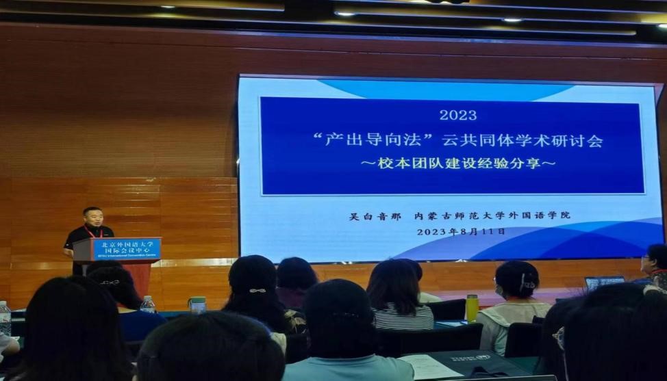 pp电子游戏平台网站英语系吴白音那教授与张婷博士代表团队参加了此次会议。作为“产出导向法”云共同体(一期)的优秀学员、英语系“产出导向法”教师专业学习共同体的牵头专家,吴白音那教授在主会场发言环节就pp电子游戏平台网站“产出导向法”共同体团队的建设过程、建设成效、建设经验以及发展规划做口头报告。张婷老师在讨论环节与在场的专家和外语教育同仁进行了积极的交流。