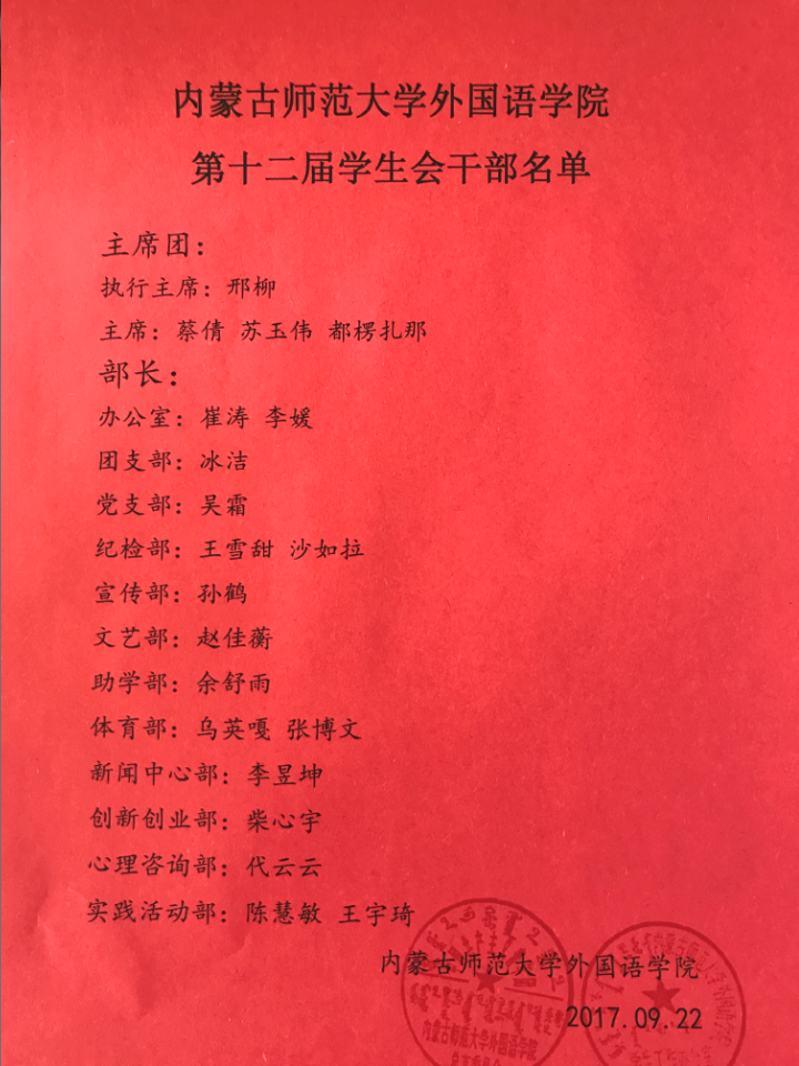 pp电子游戏平台网站第十二届学生会主席团及各部长名单公示