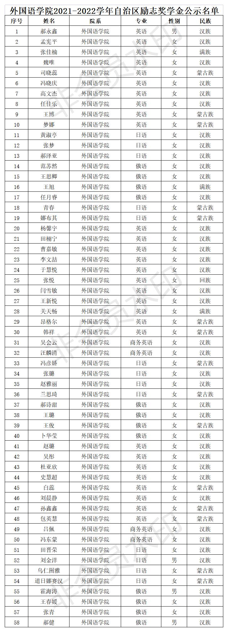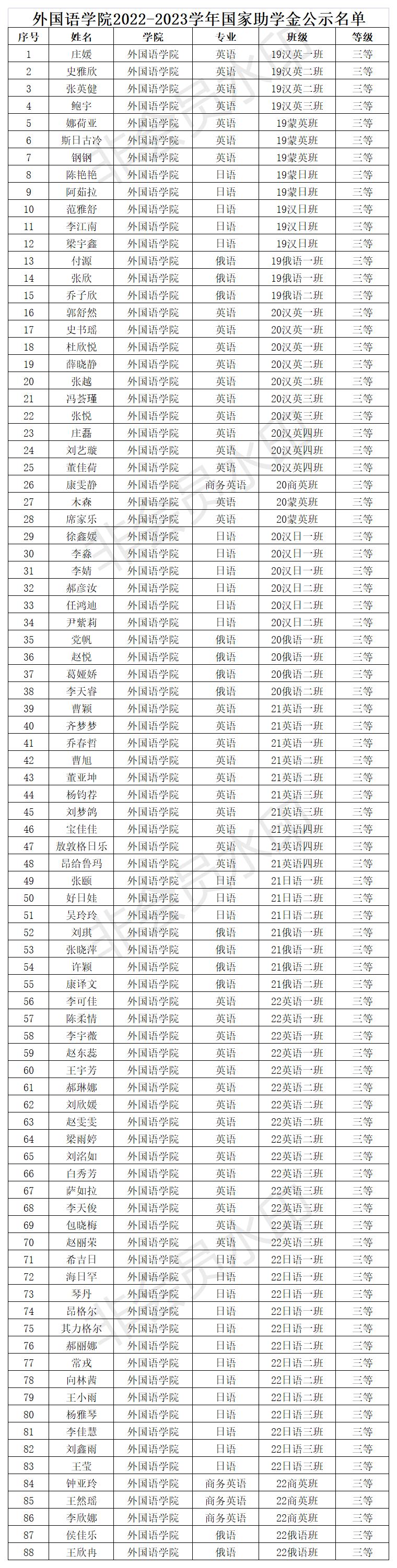 根据关于印发《pp电子游戏平台网站国家励志奖学金、国家助学金评选管理暂行办法》的通知(校发〔2015〕73号),《关于印发<pp电子游戏平台网站自治区励志奖学金评选暂行办法>的通知》(内师校发〔2021〕66 号),《关于开展 2021-2022 学年自治区励志奖学金评审工作的通知》(校学发〔2022〕19 号),以及《关于开展 2021-2022 学年国家励志奖学金、2022-2023 学年国家助学金评审工作的通知》(校学发〔2022〕17 号)等文件精神,pp电子游戏平台网站组织开展了评选工作。经学生本人申请、班级评审小组审核、班主任审核、学院评审委员会评选,最终确定拟推荐人选名单(国家励志奖学金33人,自治区励志奖学金58人,国家助学金一等88人、二等137人、三等88人)。为体现公开、公平、公正的原则,现将拟推荐名单予以公示3天。如有异议,请来电或来信反映。