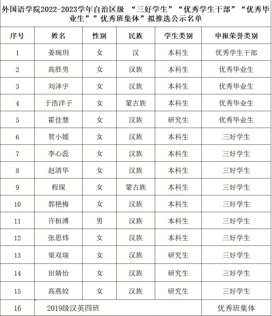 根据学校《关于开展pp电子游戏官网2022-2023学年度自治区级”三好学生”、“优秀学生干部”、“优秀毕业生"和”优秀班集体”》(校学发[2023]9号)文件要求,学院评审委员会于2023年5月5日召开了评选工作专题会议。经学生本人、班集体申请,学工组审核,拟评选出pp电子游戏平台网站 2022-2023学年自治区级”三好学生”、优秀学生干部”、“优秀毕业生”、“优秀班集体”,为体现公开、公平、公正的原则,现将拟推荐名单予以公示。如有异议,请来电或来信反映。 公示时间:5月5日﹣5月7日 受理电话:0471-7381039 邮箱:691503251@qq.com