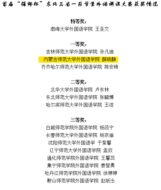 会议期间,评委会对首届“强师杯”东北三省一区学生外语讲课大赛的参赛作品进行评选,本次大赛共19所学校派选手参加。经过评审,最终评选出特等奖一名、一等奖三名、二等奖三名、三等奖八名。由pp电子游戏平台网站呼和塔拉老师指导的薛晓静同学凭借教学设计、课件制作和模拟授课等环节的突出表现,最终在大赛中脱颖而出,荣获一等奖。