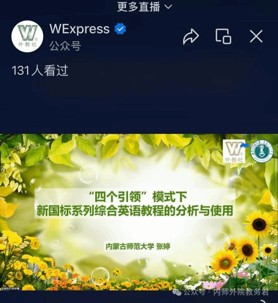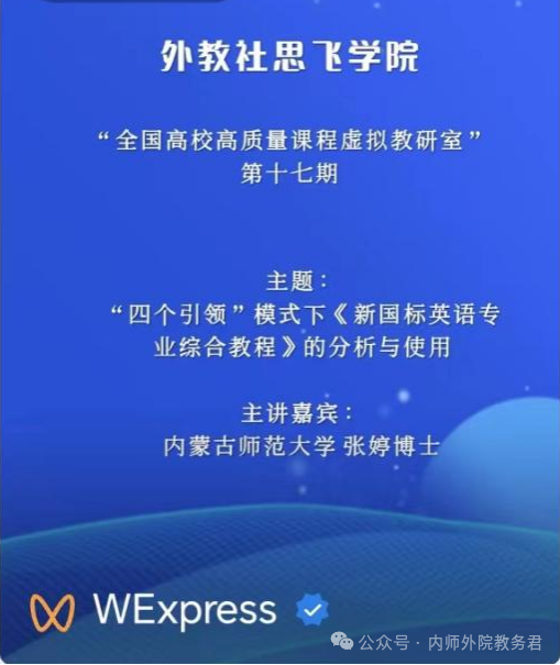 9月28日,pp电子游戏平台网站英语系《综合英语》课程团队受上海外语教育出版社思飞学院的邀请,在“全国高校高质量课程虚拟教研室”(第十七期)做教学创新经验分享,张婷博士作为团队代表担任主讲嘉宾,通过WExpress视频号直播平台以《“四个引领”模式下新国标英语专业综合教程的分析与使用》为题做教学创新实践经验分享,pp电子游戏平台网站英语系全体教师和来自全国各地高校500余名教师在线观看了直播。