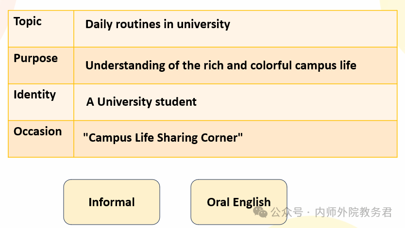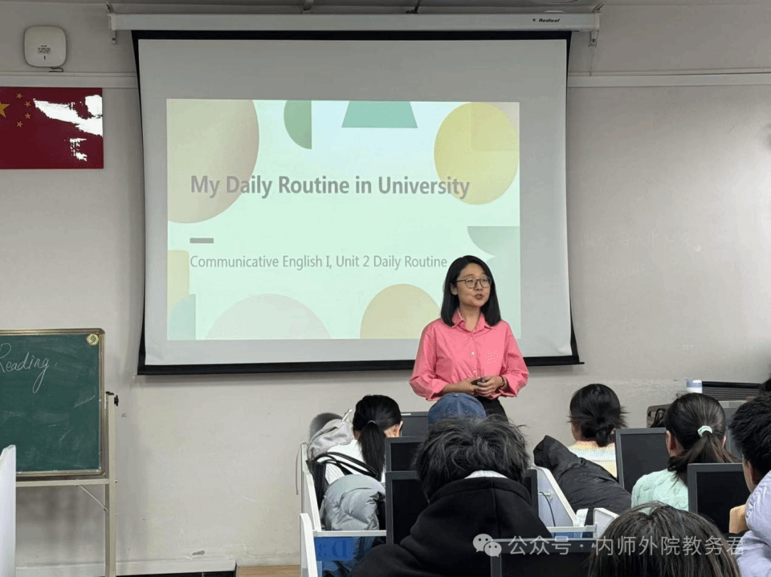示范课内容围绕大一新生的听说课程展开,教材选用《新交际英语综合教程》第一册,展示单元为第二单元,核心话题聚焦Daily Routines。田超老师采用了产出导向法(POA),以“口头介绍自己大学生活的一天”为驱动任务,任务场景设定为学校组织的国际交流生英语角活动。课堂伊始,田超老师详细分析了驱动任务的四要素:话题、身份、目的和场合,帮助学生明确语言使用的具体场景和文体风格。