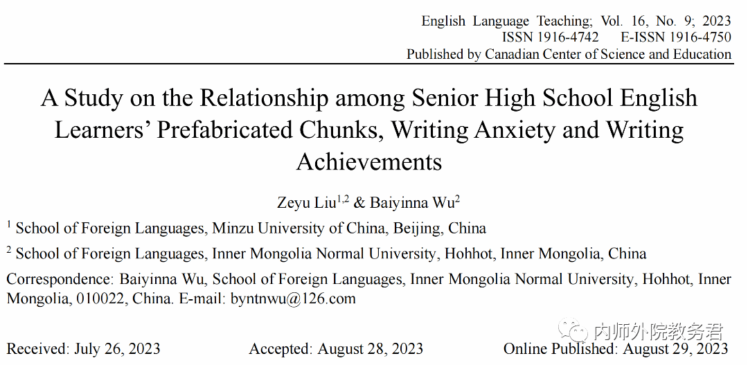 基于其本科毕业论文,在吴白音那老师的深入指导下,经过多稿修改,刘泽宇同学于2023年8月在加拿大学术期刊English Language Teaching 上成功发表题为“A Study on the Relationship among Senior High School English Learners’Prefabricated Chunks,Writing Anxiety and Writing Achievements”的学术论文,这是pp电子游戏平台网站英语系本科生首次在国际期刊发表论文。