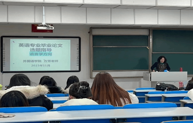 毕业论文是人才培养方案中非常重要的实践教学环节。为进一步提高本科毕业论文质量,规范本科毕业论文撰写要求,促进毕业论文工作有序开展,2023年11月28日至12月4日,英语系特别邀请我系方芳老师、刘海霞老师、何志英老师和徐雅婧老师分别就语言学及语言研究(包括语言文化)、文学研究、教学及教学法研究以及翻译理论和实践五大选题方向开展了毕业论文选题系列指导讲座。2024届全体本科毕业生参会。