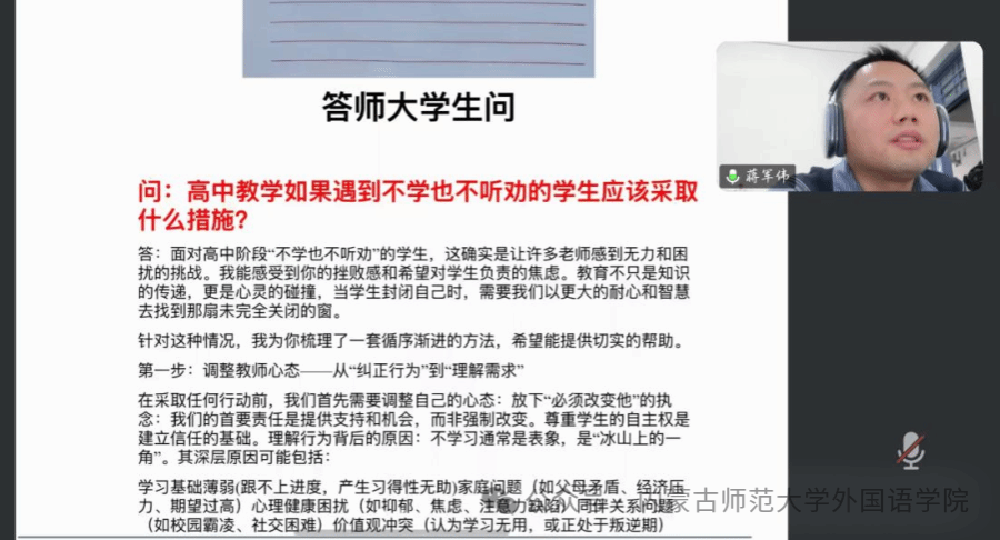 蒋军伟老师以问答形式,解答学生关于职业发展、教学管理及班主任工作的问题。