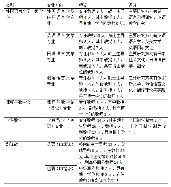 学院研究生教育开始于2001年。现有外国语言文学硕士一级学科授权点,下设英语语言文学、外国语言学及应用语言学、俄语语言文学和日语语言文学等研究方向及课程与教学论(英语)等学术型硕士学位点;有学科教学(英语)、翻译硕士(英语、俄语)2个专业硕士学位点。其中外国语言学及应用语言学于2008年被评为自治区重点培育学科。