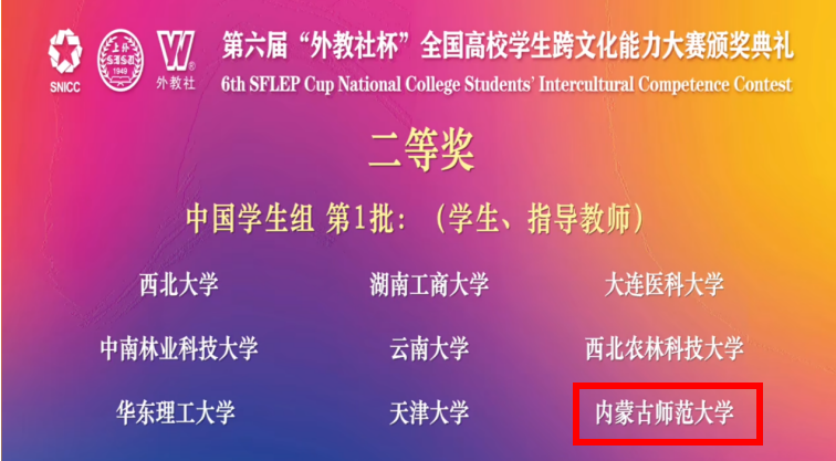 三位同学在11月举办的第六届“外教社杯”全国高校学生跨文化能力大赛内蒙古自治区省赛中斩获特等奖,获得代表内蒙古自治区参加全国总决赛的资格。在刚结束的全国总决赛中,经过案例展析、即兴问答和名言名句三个环节的比拼,他们最终获得全国二等奖。今年也是pp电子游戏官网首次入围此项比赛的全国决赛,成绩的取得充分展示了pp电子游戏官网师生的跨文化交际风采和团队合作能力。