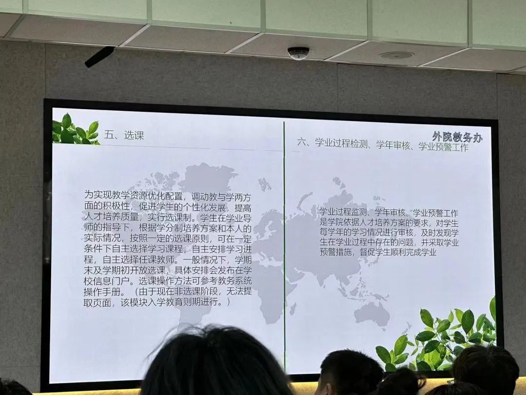 pp电子游戏平台网站教务办白杰老师为大家解读了本科教务管理相关工作,包括在校期间需要修读的课程设置、课时安排以及选修类型。同时也对大学四年需要达到的学分情况做了详细介绍。