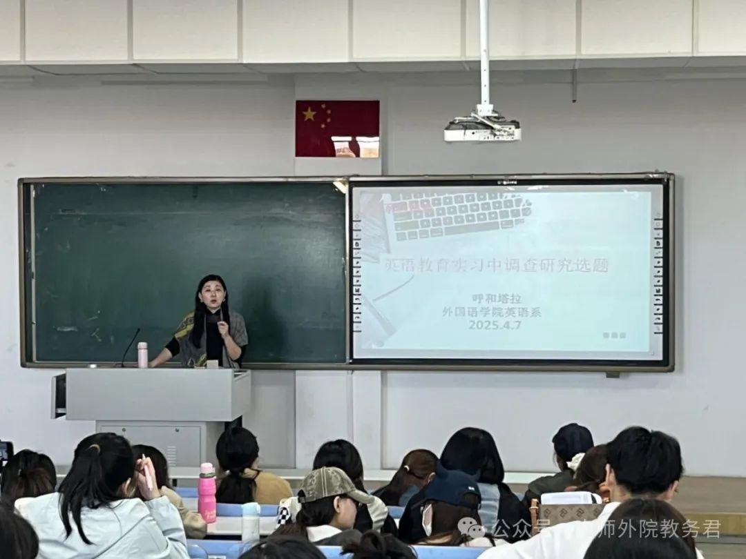 第一场讲座由呼和塔拉老师主讲,主题为“英语教育实习中调查研究选题”。她首先针对同学们在实习调查中遇到的困惑进行了深入分析。通过具体案例,呼和塔拉老师详细解析了理想的实习调查应具备的特点。她指出,实习调查通常分为调查和实验两种,选题时应注重学术性,避免陈旧话题,尤其要避免泛泛而谈的“经验之路”。实习中的调查研究应遵循外语教学的要求,具备科学性和简明性。