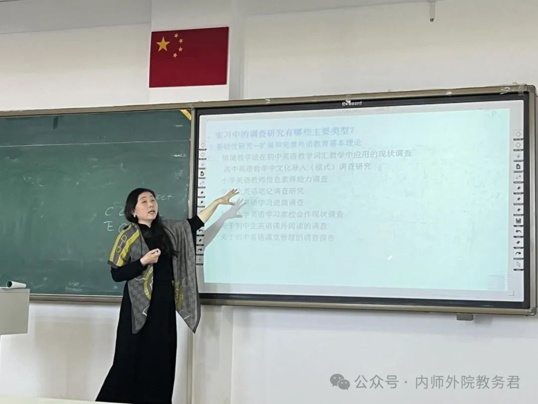 在基础性研究方面,呼和塔拉老师建议实习报告应侧重于扩展和完善外语教育的基本理论。在应用研究的调查中,她以“小组积分制在初中英语教学中的应用效果”为例,详细讲解了调查内容,并分享了调研经验。对于英语调查研究报告的撰写,呼和塔拉老师强调要从局内人变为局外人,通过客观真实的调查进行实验,以满足科学性原则。此外,呼和塔拉老师还分享了调查报告与教育研究报告的模板,并提供了撰写建议,通过具体实例为大家指明方向。最后,呼和塔拉老师建议与会实习生合理规划时间,在实习前两周内确定选题,并尽量在实习期间完成调查。讲座中,同学们与老师积极互动,认真做笔记,氛围活跃。